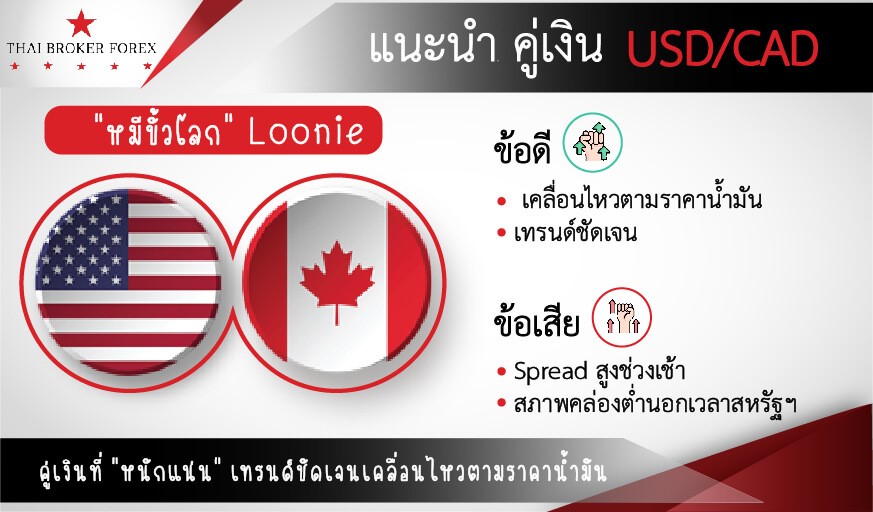 USD/CAD มีฉายาว่า Loonie เพราะแคนาดาเป็นผู้ส่งออกน้ำมันรายใหญ่ไปยังสหรัฐฯ ทำให้ราคาน้ำมันมีผลต่อค่าเงิน CAD โดยตรง ถ้าน้ำมันขึ้น CAD มักจะแข็งค่า ถ้าน้ำมันลง CAD ก็มักจะอ่อนค่า ทำให้คู่เงินนี้เป็นที่ชื่นชอบของเทรดเดอร์ที่ชอบเทรดตามราคาน้ำมัน