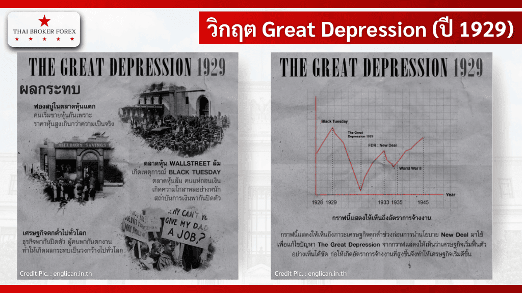 ภาพแสดงถึงวิกฤตของ Great Depression ในปี 1929 ที่มีผลกระทบเรื่องฟองสบู่ตลาดหุ้นแตก อีกทั้งเศรษฐกิจยังตกต่ำไปทั่วโลก และ อัตราการจ้างงานที่สูงขึ้นจนเศรษฐกิจเริ่มดีขึ้น