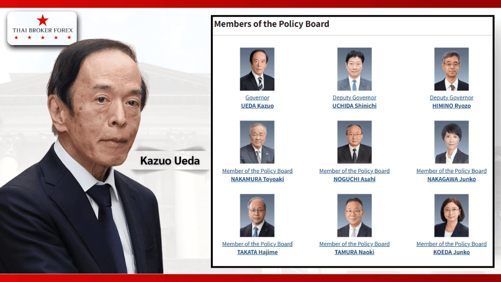 ภาพเผยให้เห็นถึง Kazuo Ueda ดำรงตำแหน่งผู้ว่าการ ของ Bank Of Japan โดยมี สมาชิก Policy Board รวม 9 ท่าน