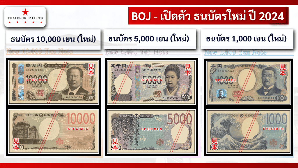 ภาพแสดงถึงการเปิดตัว ธนบัตรใหม่ปี 2024 ที่มีการปรับโฉมธนบัตร 10,000 / 5,000  และ 1,000 เยน ใหม่