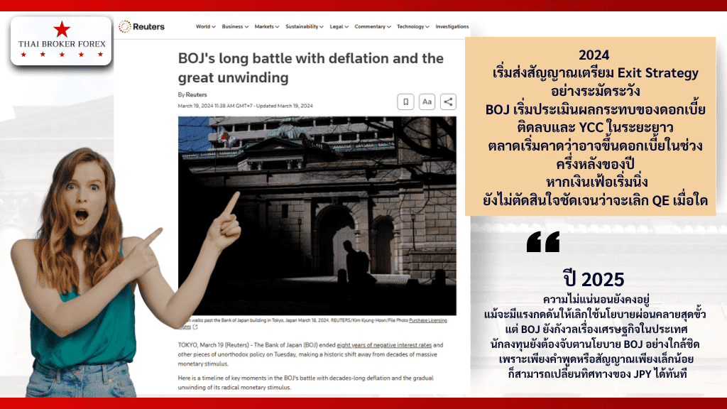 ภาพนี้อธิบายได้จากข่าว รอยเตอร์ เกี่ยวกับปี 2024 ที่ BOJ มีการประเมินผลกระทบของดอกเบี้ยติดลบ แน่นอนว่าปี 2025 ก็ยังมีความไม่แน่นอนอยู่ เพราะจะต้องจับตาเรื่องนี้อย่างใกล้ชิด