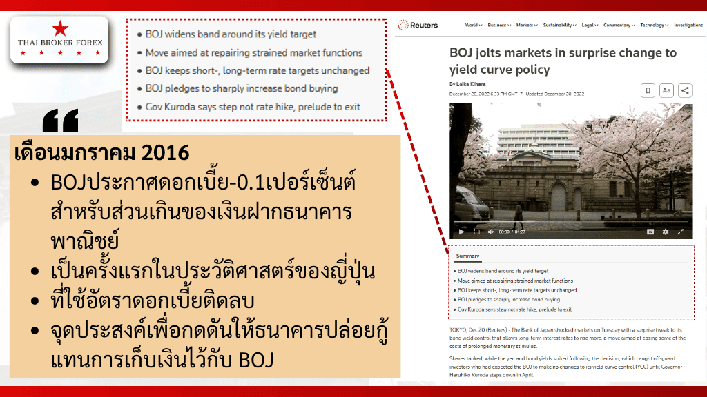 • เดือนมกราคม 2016 BOJ ประกาศดอกเบี้ย -0.1 เปอร์เซ็นต์ สำหรับส่วนเกินของเงินฝากธนาคารพาณิชย์