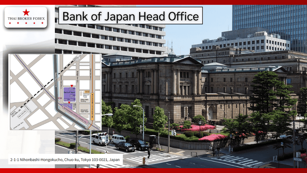 ภาพอธิบายถึงสถานที่ตั้งของ BOJ ตั้งอยู่เลขที่ 2-1-1 นิฮอนบาชิ-ฮงโกกุโช เขตชูโอ กรุงโตเกียว 103-0021 ประเทศญี่ปุ่น