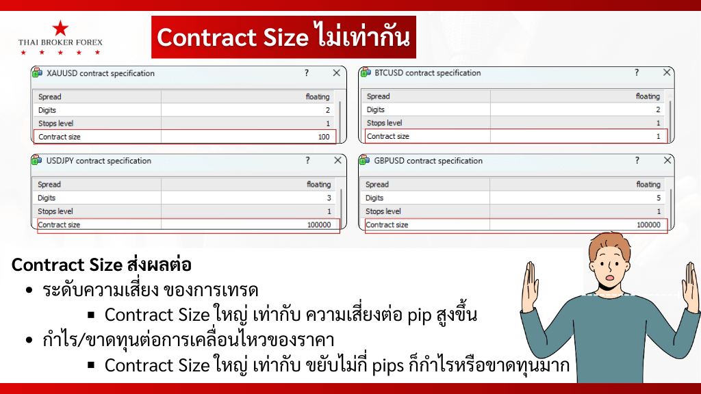 - Contract Size ใหญ่ เท่ากับ ความเสี่ยงต่อ Pip สูงขึ้น
