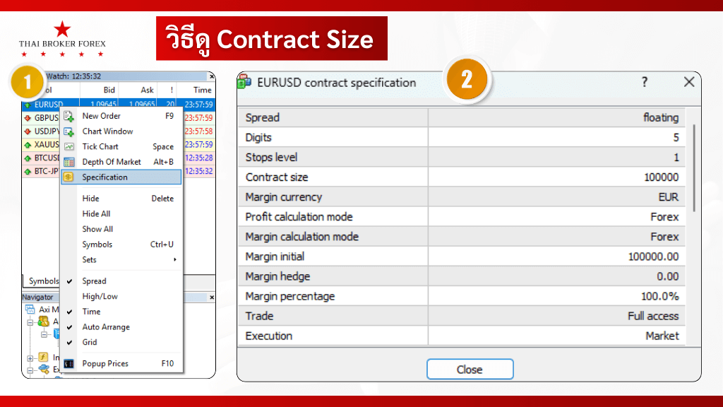 ภาพแสดงถึงวิธีการดู Contract Size โดย หมายเลข (1) ให้คลิกขวาที่ราคาคู่สกุลเงินที่ต้องการดู เลือกเมนู Specification จะมีหน่าต่างหมายเลข (2) ปรากฏขึ้น โดยจะระบุรายละเอียดของผลิตภัณฑ์นี้ ในตัวอย่างคือ EURUSD