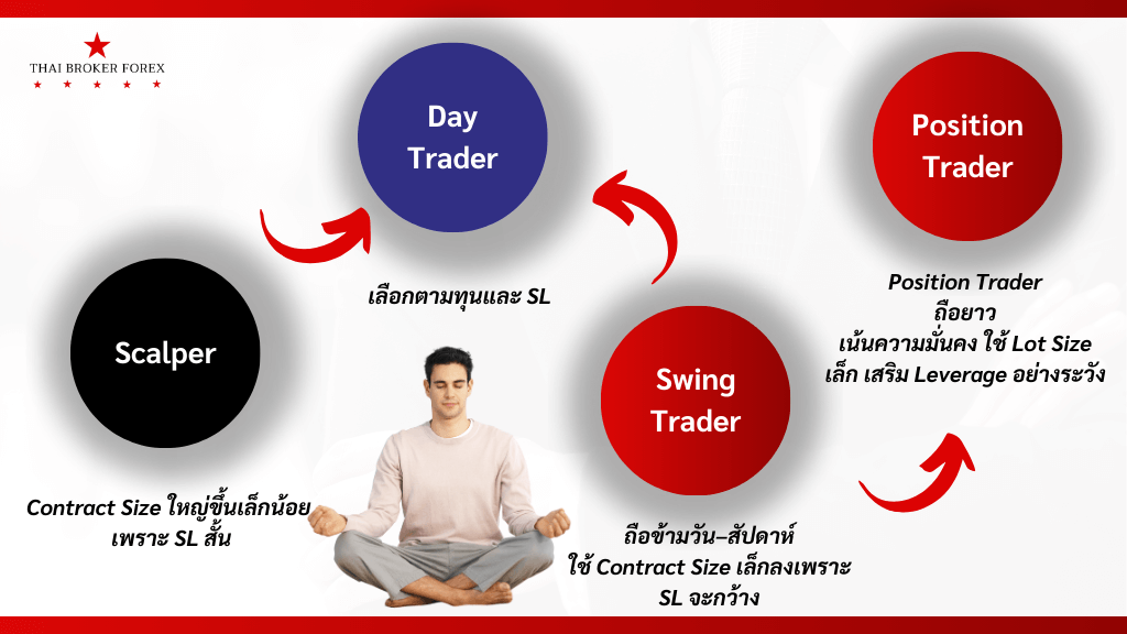 | Scalper | เทรดสั้นมาก, เป้า 5–10 pips | ใช้ Contract Size ใหญ่ขึ้นเล็กน้อย เพราะ SL สั้น |