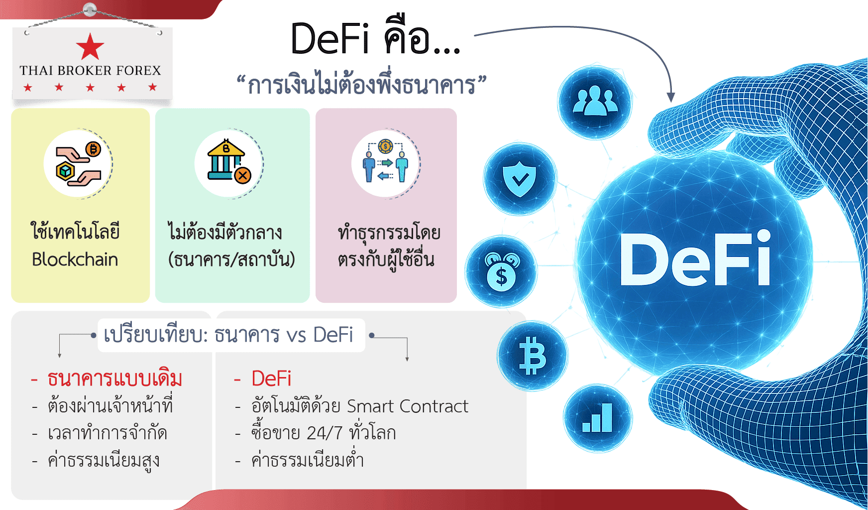 - DeFi ทำลายความจำเป็นของโบรกเกอร์ โดยใช้ Smart Contract แทนที่ ทำให้นักลงทุนสามารถซื้อขายเงินตราได้โดยตรงผ่าน Decentralized Exchange (DEX) โดยเสียค่าธรรมเนียมเพียงเล็กน้อยให้กับเครือข่าย Blockchain เท่านั้น