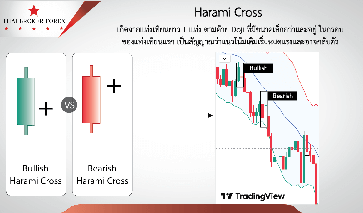 - เกิดจากแท่งเทียนยาว 1 แท่ง ตามด้วย Doji ที่มีขนาดเล็กกว่าและอยู่ ในกรอบ ของแท่งเทียนแรก เป็นสัญญาณว่าแนวโน้มเดิมเริ่มหมดแรงและอาจกลับตัว