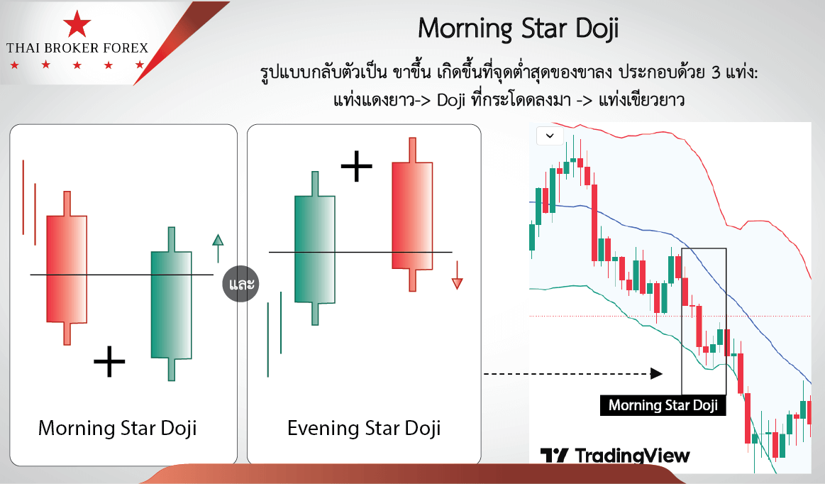 - รูปแบบกลับตัวเป็น ขาขึ้น เกิดขึ้นที่จุดต่ำสุดของขาลง ประกอบด้วย 3 แท่ง: แท่งแดงยาว -> Doji ที่กระโดดลงมา -> แท่งเขียวยาว