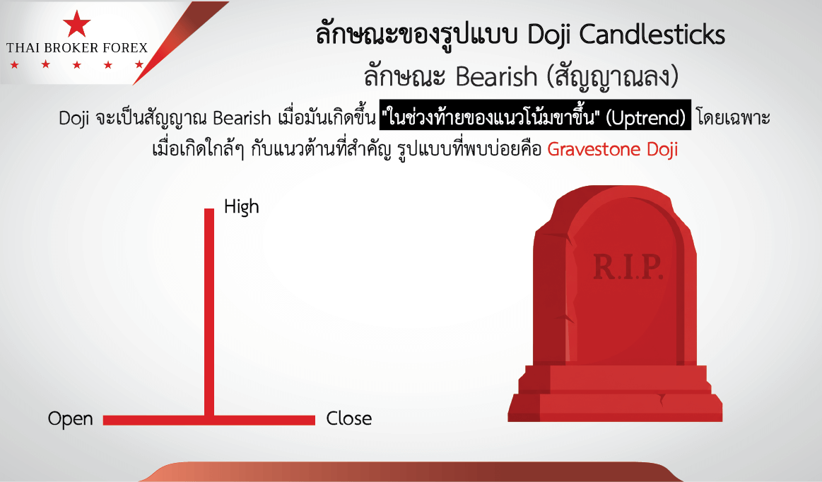 ในทางกลับกัน Doji จะเป็นสัญญาณ Bearish เมื่อมันเกิดขึ้น “ในช่วงท้ายของแนวโน้มขาขึ้น” (Uptrend) โดยเฉพาะเมื่อเกิดใกล้ๆ กับแนวต้านที่สำคัญ รูปแบบที่พบบ่อยคือ Gravestone Doji