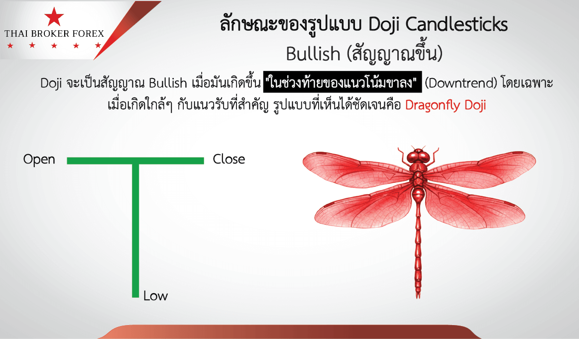 Doji จะเป็นสัญญาณ Bullish เมื่อมันเกิดขึ้น “ในช่วงท้ายของแนวโน้มขาลง” (Downtrend) โดยเฉพาะเมื่อเกิดใกล้ๆ กับแนวรับที่สำคัญ รูปแบบที่เห็นได้ชัดเจนคือ Dragonfly Doji