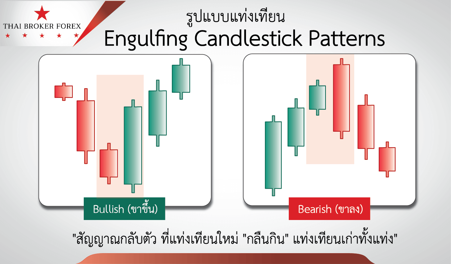 รูปแบบกลับตัวเป็นขาขึ้น (Bullish Engulfing) และรูปแบบกลับตัวเป็นขาลง (Bearish Engulfing) รูปแบบนี้แตกต่างจากแท่งเทียนปกติ โดยที่แท่งเทียนที่สองจะมีขนาดใหญ่และ “กลืนกิน” (Engulfs) ลำตัวของแท่งเทียนแรกทั้งแท่ง สะท้อนถึงการต่อสู้ที่ฝั่งตรงข้ามกลับมาชนะอย่างเด็ดขาด และพลิกการควบคุมตลาดกลับมา
