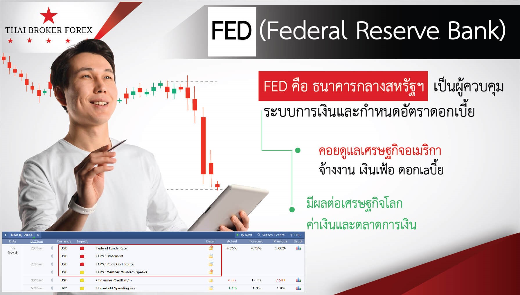 - FED (Federal Reserve Bank) หรือ FED คือ ธนาคารกลางของสหรัฐอเมริกา ทำหน้าที่เหมือนเป็น “หัวใจ” ของระบบการเงินอเมริกา ควบคุมเรื่องเงิน ๆ ทอง ๆ ของประเทศ