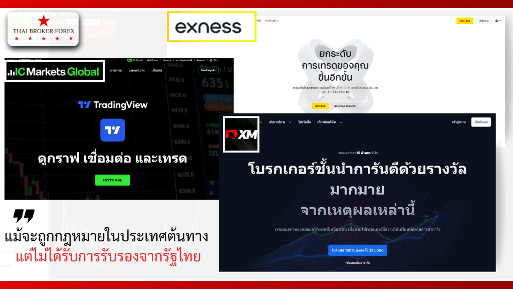 • นักลงทุนไทยจึงมักใช้บริการ “โบรกต่างประเทศ” ที่เปิดให้คนไทยสมัครใช้งานได้ เช่น Exness, IC Markets, XM ฯลฯ ซึ่งแม้จะถูกกฎหมายในประเทศต้นทาง แต่ไม่ได้รับการรับรองจากรัฐไทย