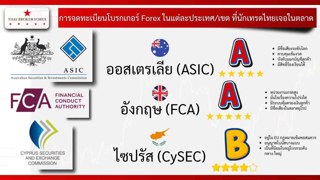 คนไทยนิยมเทรดกับโบรกที่จดทะเบียนในไซปรัส (CySEC), ออสเตรเลีย (ASIC) และเซเชลส์/เซนต์วินเซนต์ (FSA/FSC) เพราะไซปรัสและออสเตรเลียมีความน่าเชื่อถือ ส่วนเซเชลส์แม้ควบคุมไม่เข้มมาก แต่ให้ Leverage สูงและไม่จำกัดการเทรดข่าว จึงเหมาะกับสายเก็งกำไร