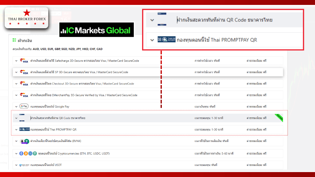 ตัวอย่างของโบรกเกอร์ IC Markets ที่มีช่องทางฝาก-ถอน ผ่านธนาคารไทย รวมไปถึงการฝากเงินผ่าน QR PROMPTPAY ที่สะดวกและรวดเร็ว
