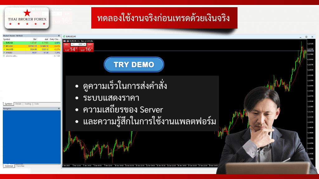 • เปิดบัญชี Demo เพื่อดูความเร็วในการส่งคำสั่ง ระบบแสดงราคา ความเสถียรของ Server และความรู้สึกในการใช้งานแพลตฟอร์ม