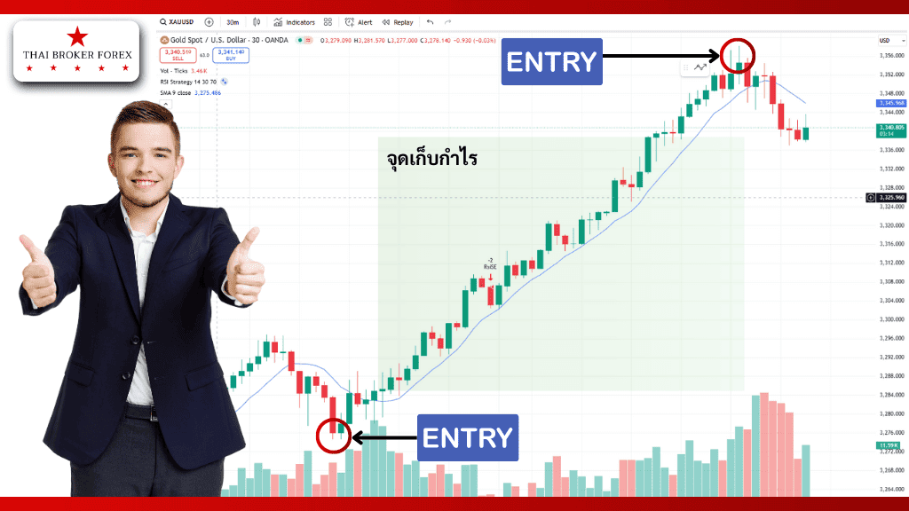 ภาพอธิบายถึงการมองหาจุดเข้าที่ดี นักเทรดมักจะกำหนดกำไรได้อย่างมหาศาล แต่ถ้าจุดเข้าไม่ดี ก็อาจจะทำให้ขาดทุนได้ แน่นอนว่าในภาพคือจุดเข้าที่สวยงาม แต่ภาพความจริงนั้นมีทั้งความกดดัน ความกังวลมากมาย