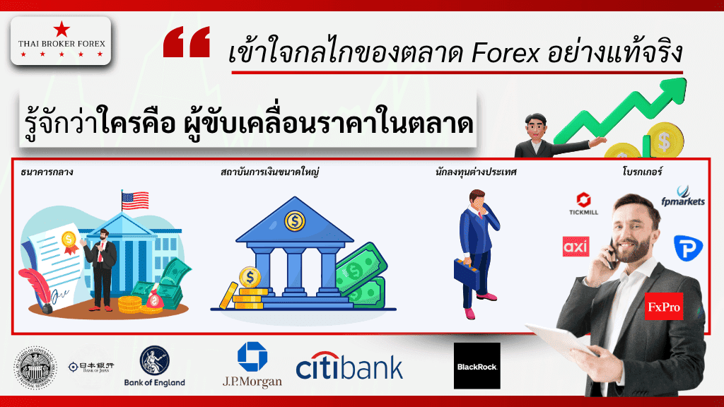 ภาพอธิบายถึง ผู้ขับเคลื่อนราคาในตลาด Forex ที่มีทั้งธนาคารกลาง พร้อมกับสถาบันการเงินรายใหญ่ รวมไปถึง นักลงทุนต่างประเทศ และ โบรกเกอร์ต่าง ๆ ที่ร่วมเป็นผู้เล่นซึ่งต้องเข้าใจว่ากลไกว่าตลาด Forex คืออะไรอย่างแท้จริง