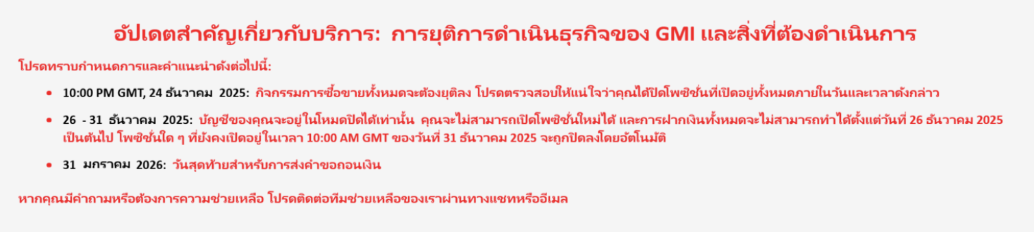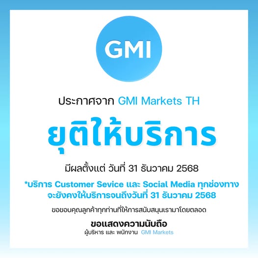 เมื่อวันที่ 17 Dec 2025 เวลา 8.41 PM ทาง GMI Markets ที่ส่ง Email ให้กับลูกค้าในประเทศไทย ว่าจะทำการ “ยุติ” การดำเนินธุรกิจของบริษัท โดยแจ้งว่า Global Market Index LLC (SVG) / GMI Global Market Index Limited (St. Lucia) จะยุติการให้บริการซื้อขายฟอเร็กซ์ทั่วโลก โดยมีผลกับลูกค้าทุกราย ภายใต้แผนการปิดการดำเนินธุรกิจ