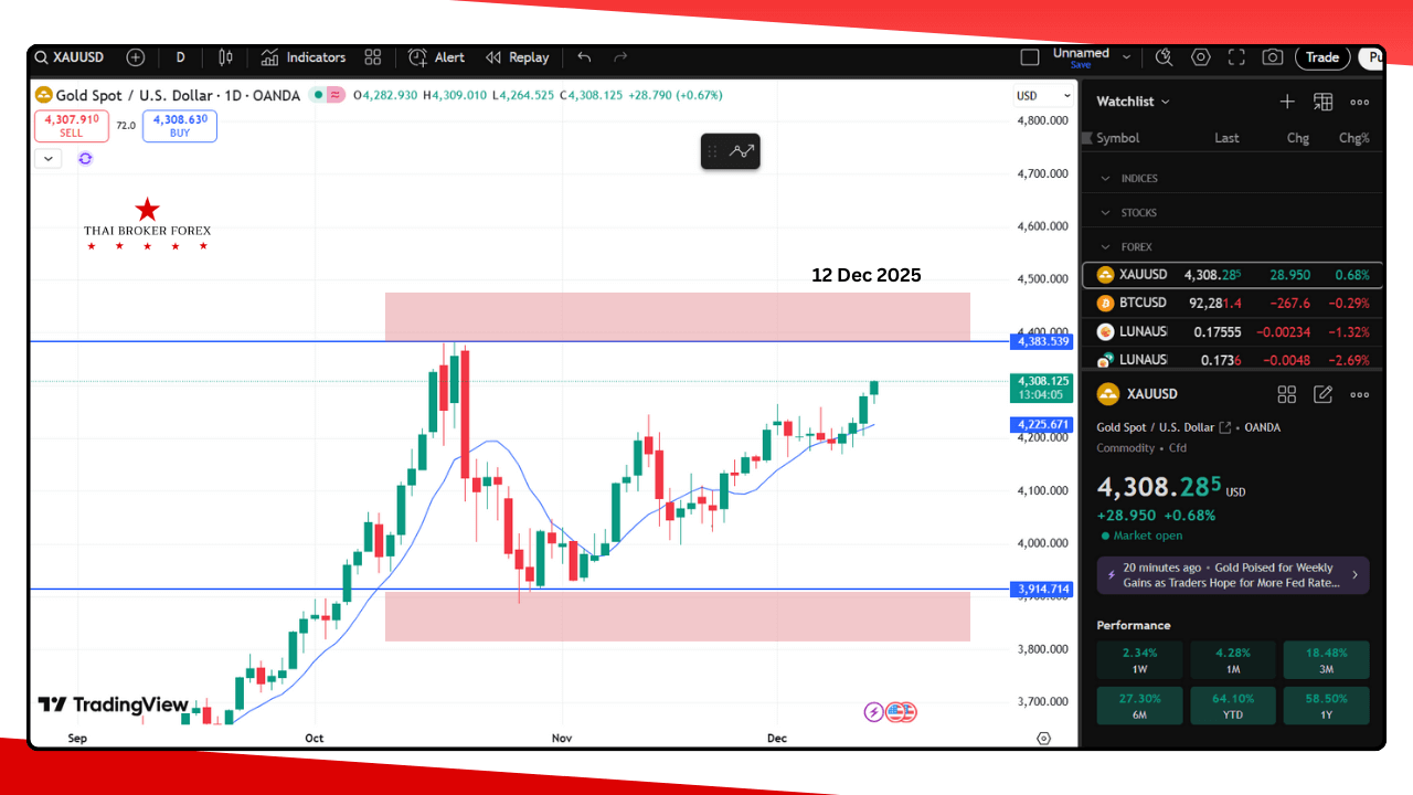 ภาพแสดงกราฟราคาทองคำ XAUUSD เมื่อวันที่ 12 ธันวาคม 2025 โดยเทรนด์ของราคายังอยู่ในกรอบขาขึ้นอย่างชัดเจน และ มีราคาสูงสุดเดิมอยู่ที่ $4,383/Oz.