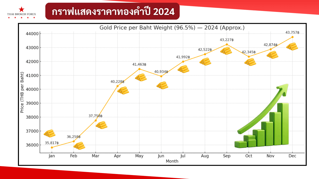 ภาพแสดงราคาทองคำปี 2024 (มกราคม-ธันวาคม) หน่วยสกุลเงินเป็น ไทยบาท / ทองคำ 1 บาท