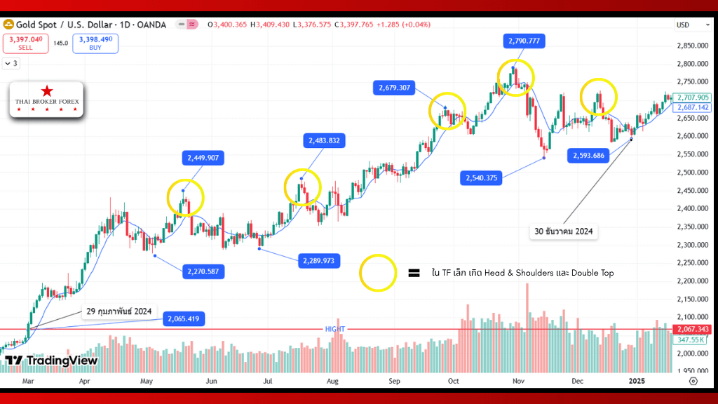 เริ่มปี 2025 ทองคำก็พุ่งขึ้นไม่หยุด จากแท่งกราฟ รายวัน จะเห็นได้ว่าทองคำมีการยกตัวก่อนทะลุแนวต้าน $2,790 เรียกได้ว่าเป็นฝั่งขา Buy อย่างเต็มตัว