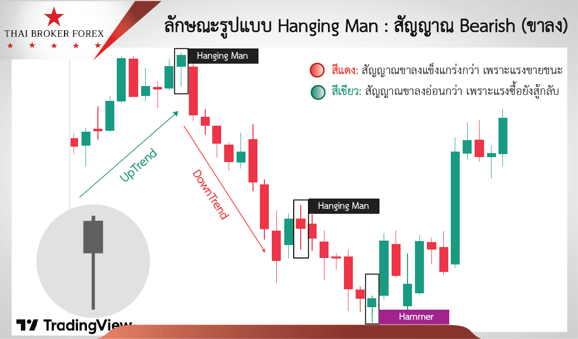 - Hanging Man สีแดง (ราคาปิดต่ำกว่าราคาเปิด): เป็นสัญญาณ Bearish ที่แข็งแกร่งกว่า เพราะแสดงให้เห็นว่าในตอนท้ายของวัน แรงขายสามารถเอาชนะแรงซื้อและกดราคาให้ปิดต่ำกว่าราคาเปิดได้