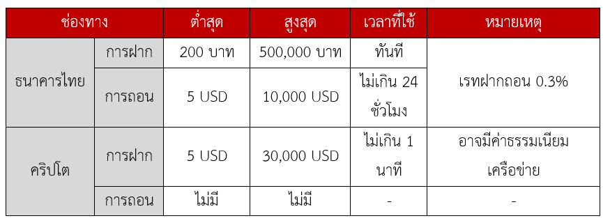 | ฝากถอนผ่านคริปโต | ฝากได้ แต่ถอนไม่ได้ |