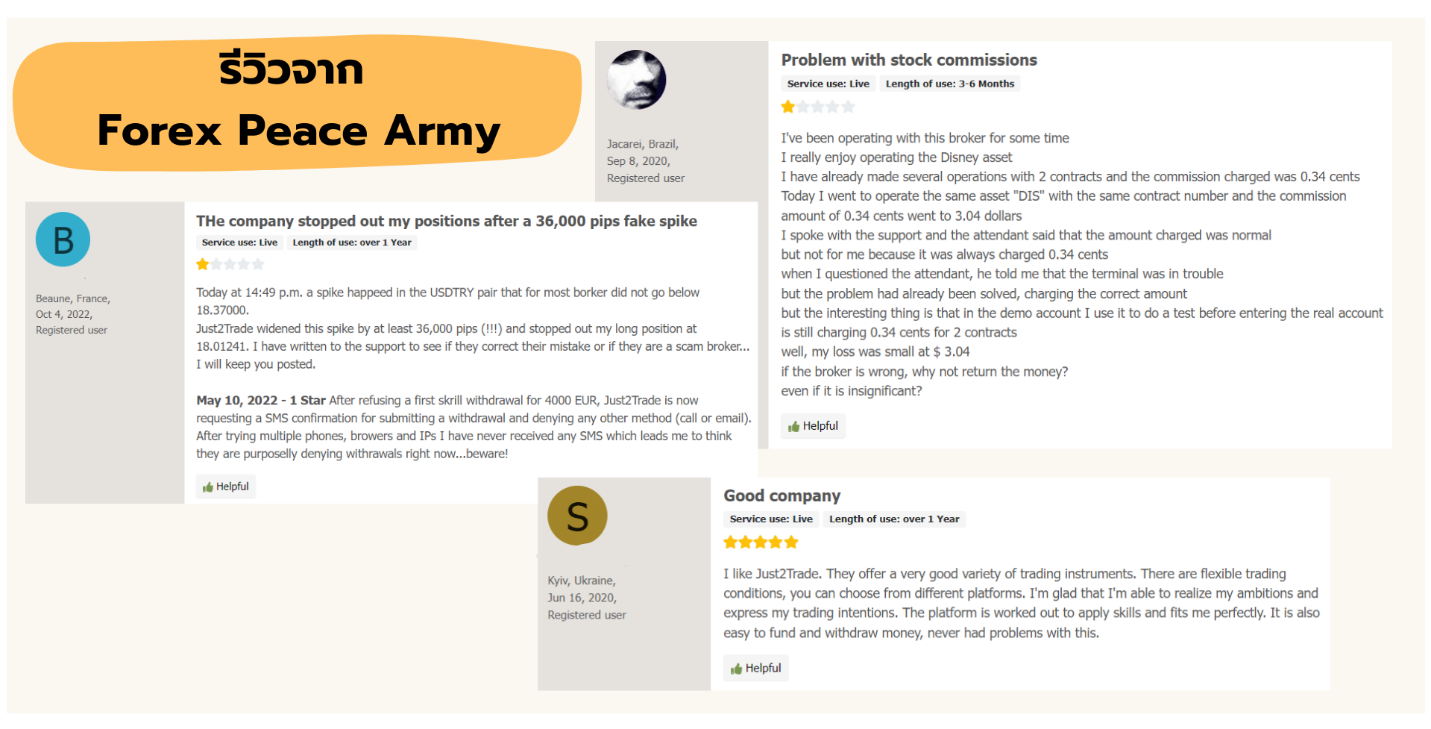 “ ประสบการณ์ของฉันกับ Just2Trade น่าผิดหวังมา อย่างแรก พวกเขาให้คุณลงทุนเงินมากขึ้นเรื่อย ๆ พวกเขาสัญญาว่าฉันจะได้รับคำแนะนำและการบริหารความเสี่ยงเพื่อให้แน่ใจว่าการซื้อขายจะได้รับการจัดการโดยไม่สูญเสียเกินสมควร อย่างไรก็ตาม ไม่มีคำแนะนำหรือการบริหารความเสี่ยงดังกล่าว และการซื้อขายทั้งหมดไม่มีมาตรการใด ๆเลย และฉันก็สูญเสียเงินครึ่งหนึ่งในการซื้อขายครั้งแรกนั้นเอง โปรดระวังให้ดี นี่เป็นการหลอกลวงโดยสมบูรณ์ สิ่งเดียวที่พวกเขาต้องการคือทำให้คุณลงทุนมากขึ้นเรื่อย ๆ ฉันโชคดีที่สามารถกู้เงินทั้งหมดคืนได้ด้วยความช่วยเหลือจากผู้เชี่ยวชาญ โดยมีรายละเอียดอยู่ในประวัติของฉัน ”