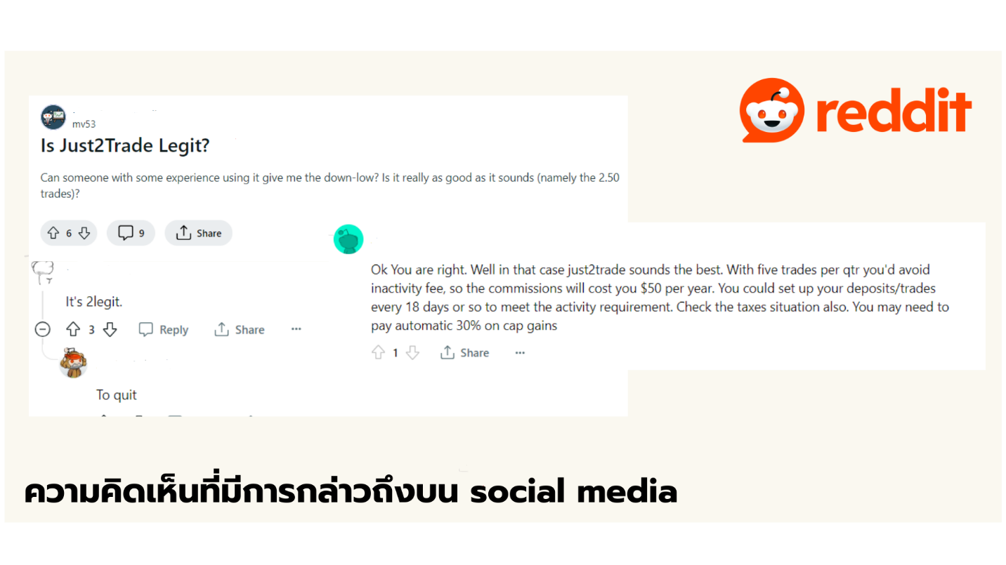 เนื่องจากโบรกเกอร์ Just2trade เป็นโบรกที่มีผู้ใช้งานจริงและรีวิวในประเทศไทยน้อยมาก ทำให้ไม่สามารถยืนยันในส่วนของทิศทางการตอบรับได้ ในส่วนของตัวเว็บไซต์และฝ่ายบริการลูกค้าก็ยังไม่มีภาษาไทยรองรับ ไม่มีโปรแกรมในการช่วยแปลภาษา ทำให้อาจจะไม่สะดวกในการใช้งานและการติดต่อของเทรดเดอร์ชาวไทย ซึ่งอาจเป็นหนึ่งในสาเหตุที่โบรกเกอร์นี้ไม่เป็นที่นิยมในประเทศไทย