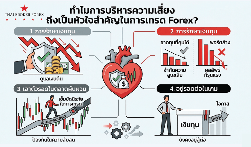 ตลาด Forex ขึ้นชื่อเรื่องความผันผวนสูงและคาดเดาได้ยาก ทักษะการ Manage Risk จึงเปรียบเสมือนเข็มขัดนิรภัยที่ช่วยปกป้องเงินทุนของคุณ ข้อมูลจากเว็บไซต์การลงทุนระดับโลก มักระบุตรงกันว่า เป้าหมายสูงสุดของการ Manage Risk ไม่ใช่การทำกำไรให้ได้มากที่สุด แต่คือ “การรักษาเงินทุน” (Preservation of Capital) เพราะหากปราศจากเงินทุน คุณก็ไม่สามารถยืนหยัดในตลาดนี้ได้เลย