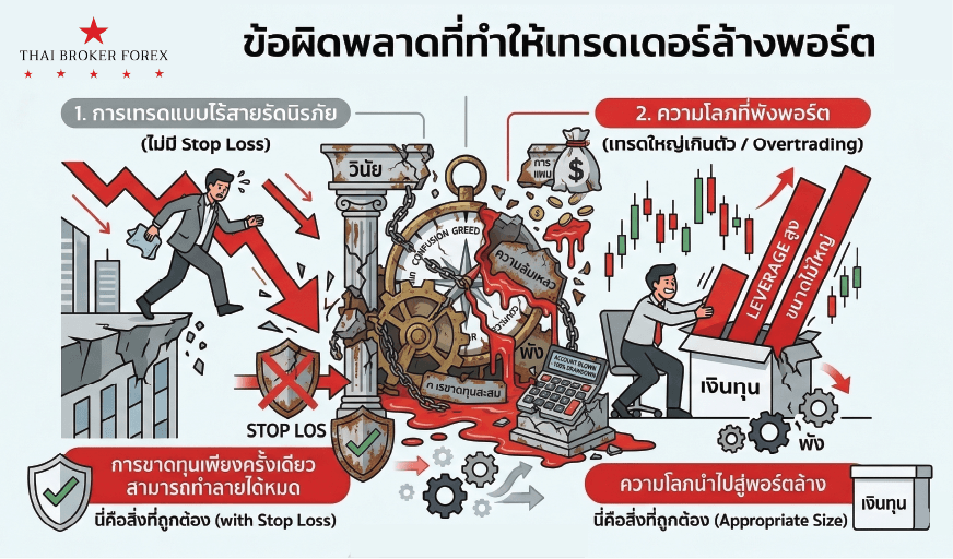 - การเปิดขนาดไม้ที่ใหญ่เกินไป (Overtrading / Undercapitalization): ความโลภที่ทำให้เทรดเดอร์ใช้ Leverage สูงเกินกว่าเงินทุนจะรับไหว เมื่อตลาดสะบัดผิดทางเพียงเล็กน้อย ก็ส่งผลให้พอร์ตระเบิดได้อย่างรวดเร็ว