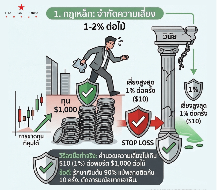 - วิธีลงมือทำจริง: หากคุณมีเงินทุน $1,000 การตั้งค่าตัดขาดทุน (Stop Loss) ในไม้นั้นจะต้องคำนวณให้เสียเงินไม่เกิน $10 ข้อดีคือ ต่อให้คุณเทรดพลาดติดกันถึง 10 ครั้ง คุณก็ยังมีเงินทุนเหลือสู้ต่อถึง 90% กฎนี้ช่วยตัดอารมณ์อยากเอาคืน และป้องกันการล้างพอร์ตได้ดีที่สุด