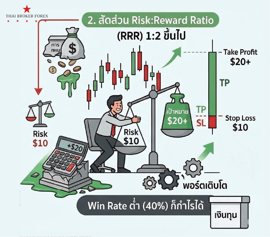 - วิธีลงมือทำจริง: หากคุณคำนวณความเสี่ยงที่ยอมรับได้ตามกฎ 1% คือยอมเสีย $10 (Risk) เป้าหมายการทำกำไร (Take Profit) ของคุณในไม้นั้นต้องตั้งไว้ที่ $20 (Reward) ขึ้นไป ความลับของเทคนิคนี้คือ แม้คุณจะเทรดชนะแค่ 40% (Win Rate ต่ำกว่าครึ่ง) แต่ผลลัพธ์รวมในระยะยาว พอร์ตของคุณก็จะยังคงมีกำไรและเติบโตได้