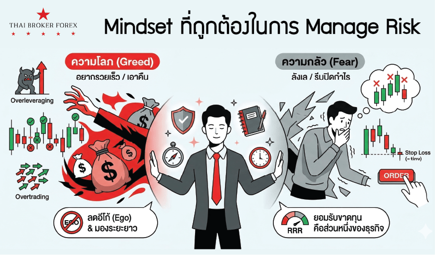 เว็บไซต์ที่เชี่ยวชาญด้านจิตวิทยาการเทรดอย่าง Babypips และ Investopedia เน้นย้ำว่า แม้คุณจะมีระบบเทรด (Trading Strategy) ที่สมบูรณ์แบบแค่ไหน แต่ถ้าสอบตกเรื่องอารมณ์ (Trading Psychology) คุณก็ไม่สามารถอยู่รอดในตลาด Forex ระยะยาวได้ อารมณ์หลักที่มักจะเข้ามาทำลายแผนการ Manage Risk มี 2 ตัวการใหญ่ๆ คือ