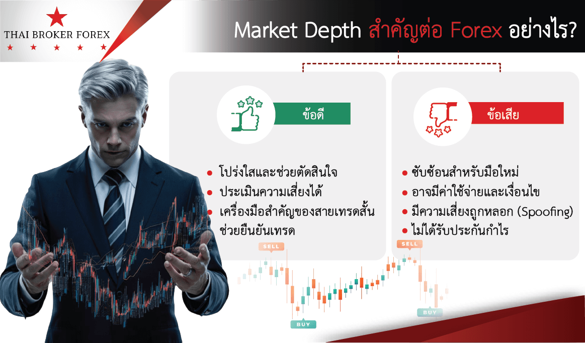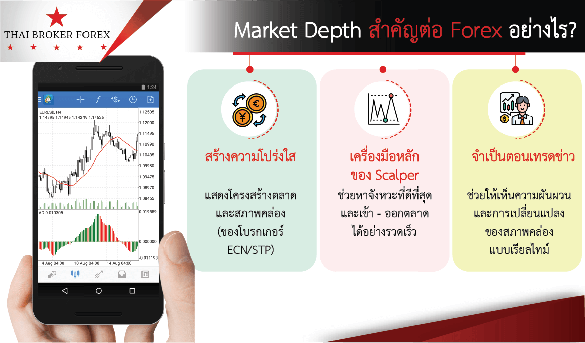 ใน ตลาด Forex ซึ่งเป็นตลาดที่มีสภาพคล่องสูงที่สุดในโลก Market Depth มีความสำคัญมาก โดยเฉพาะอย่างยิ่งสำหรับนักเทรดระยะสั้น (Scalpers) และนักเทรดระหว่างวัน (Day Traders)