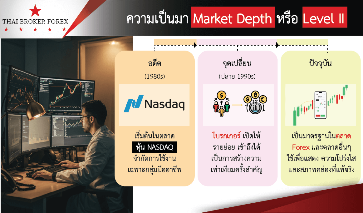 ในอดีต, ข้อมูล Market Depth หรือ Level II Quote เคยเป็นเครื่องมือลับเฉพาะของนักลงทุนสถาบันและผู้ดูแลสภาพคล่องรายใหญ่เท่านั้น แต่ในปัจจุบัน มันได้กลายเป็นเครื่องมือที่ได้รับความนิยมและเข้าถึงได้ง่ายขึ้นมากสำหรับเทรดเดอร์รายย่อยที่ต้องการความได้เปรียบในสนามแข่งขันที่ดุเดือด