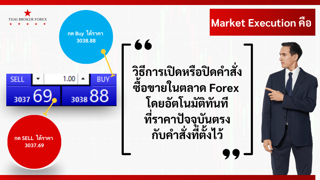 - Market Execution คือ วิธีการเปิดหรือปิดคำสั่งซื้อขายใน ตลาด Forex โดยอัตโนมัติทันทีที่ราคาปัจจุบันตรงกับคำสั่งที่ตั้งไว้