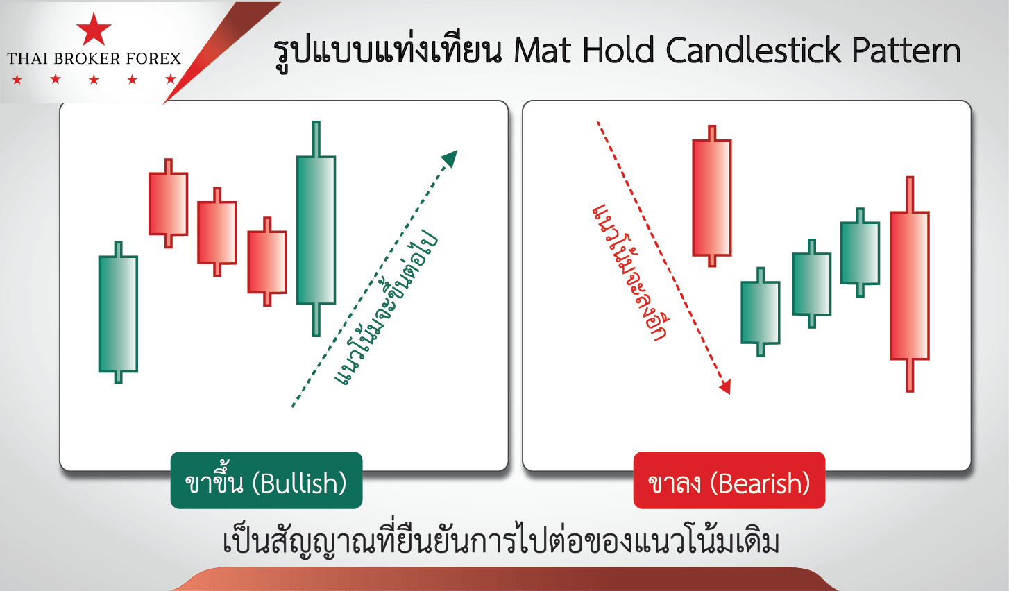 รูปแบบกราฟ Mat Hold Candlestick Pattern สามารถเป็นได้ทั้ง Bullish (ขาขึ้น) และ Bearish (ขาลง) เนื่องจากเป็นสัญญาณ เพื่อยืนยันการดำเนินต่อไปของแนวโน้มเดิม ไม่ว่าแนวโน้มนั้นจะเป็นขาขึ้นหรือขาลงก็ตาม