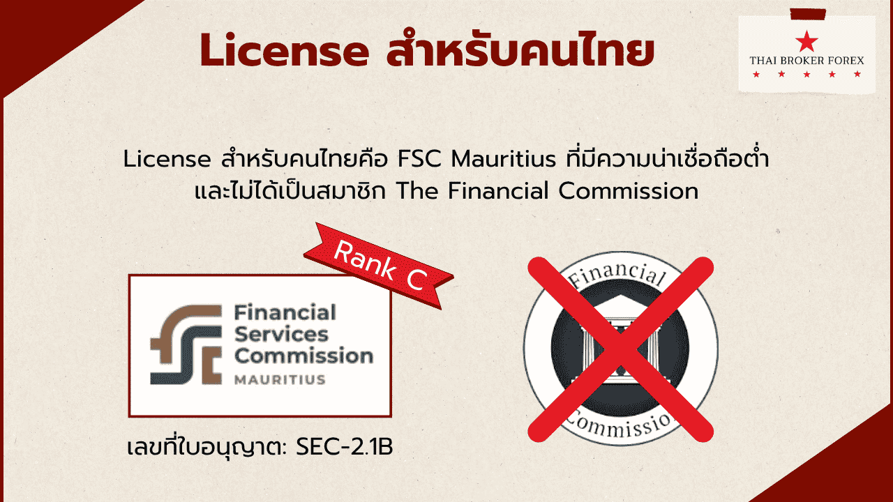 - License สำหรับคนไทยคือ FSC Mauritius ซึ่งเป็น License จากประเทศหมู่เกาะที่มีความน่าเชื่อถือต่ำ และไม่ได้เป็นสมาชิกของ The Financial Commission เคสที่คนไทยถอนเงินไม่ได้ก็มีให้เห็นแล้ว แปลว่า FSC Mauritius ช่วยอะไรไม่ได้เลย