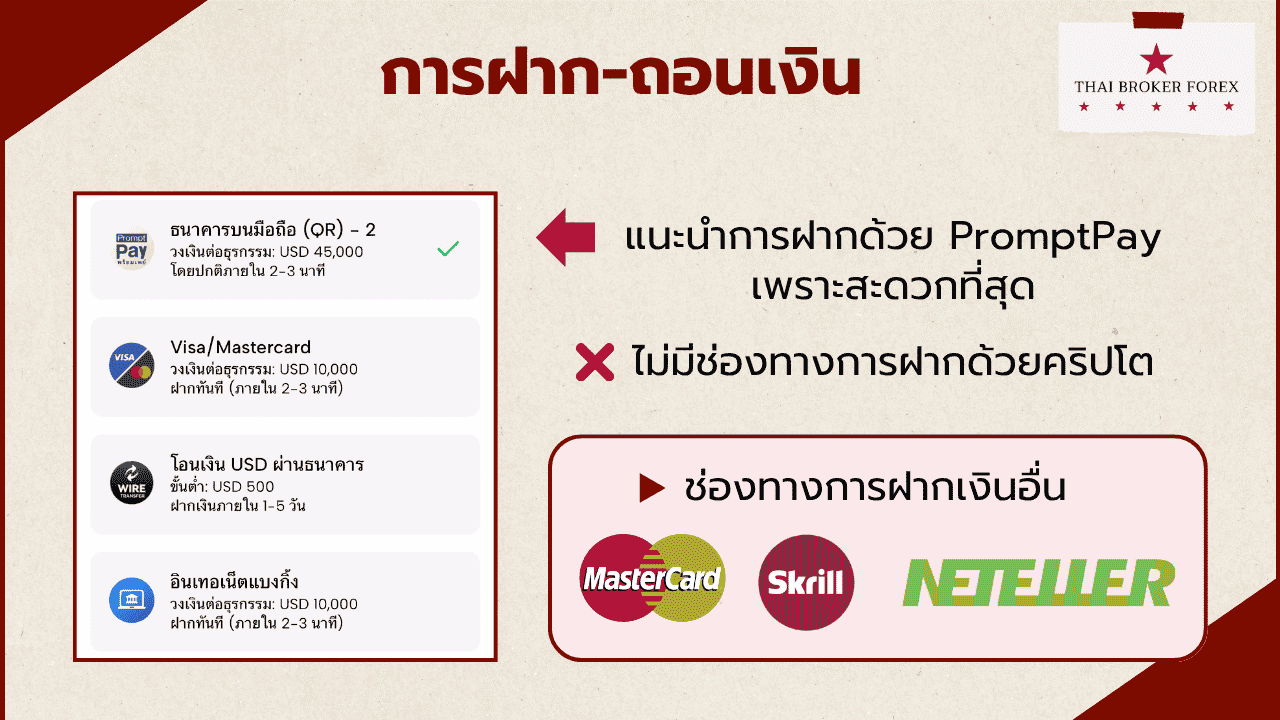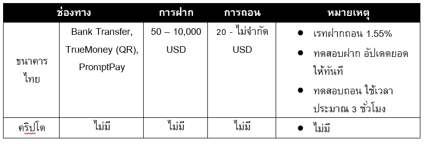 - ไม่มีช่องทางการฝากถอนผ่านคริปโต