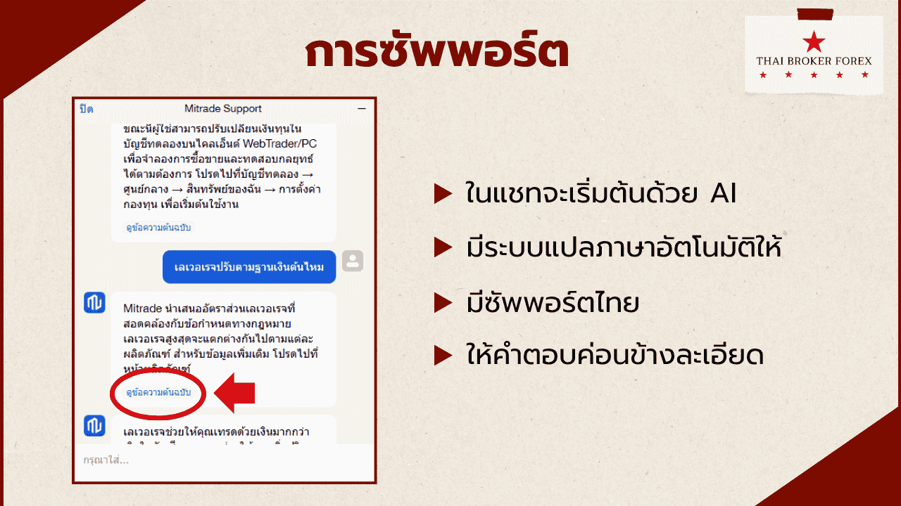 - ด้านอื่นๆ ของ Mitrade ก็ไม่มีอะไรเด่น การฝากถอนเงินมีเรทค่อนข้างสูง ถอนเงินช้า เงื่อนไขโบนัสยุ่งยาก ส่วนที่พอจะเป็นข้อดีได้หลักๆ มีแค่เรื่องซัพพอร์ตทำงานไว ให้ข้อมูลตรงประเด็น แต่ก็ได้คุยกับ AI บ่อยกว่าคนอยู่ดี