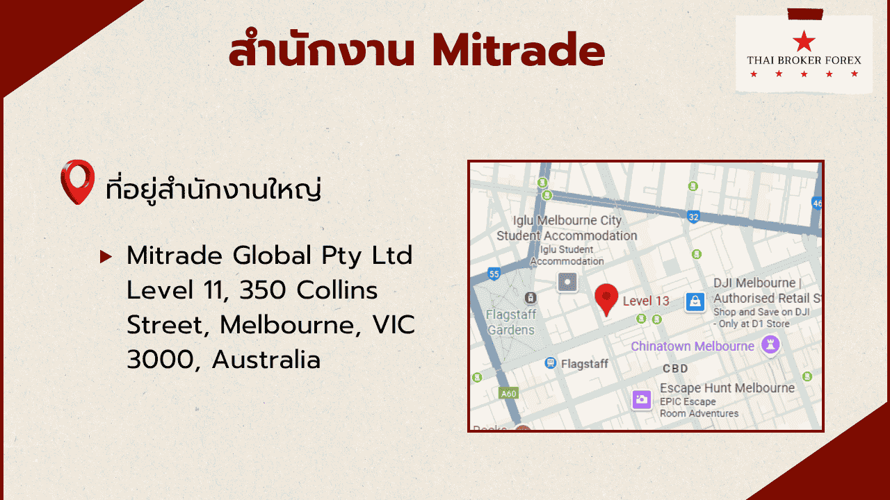 ที่อยู่สำนักงานใหญ่ : Mitrade Global Pty Ltd Level 11, 350 Collins Street, Melbourne, VIC 3000, Australia (Google Map)