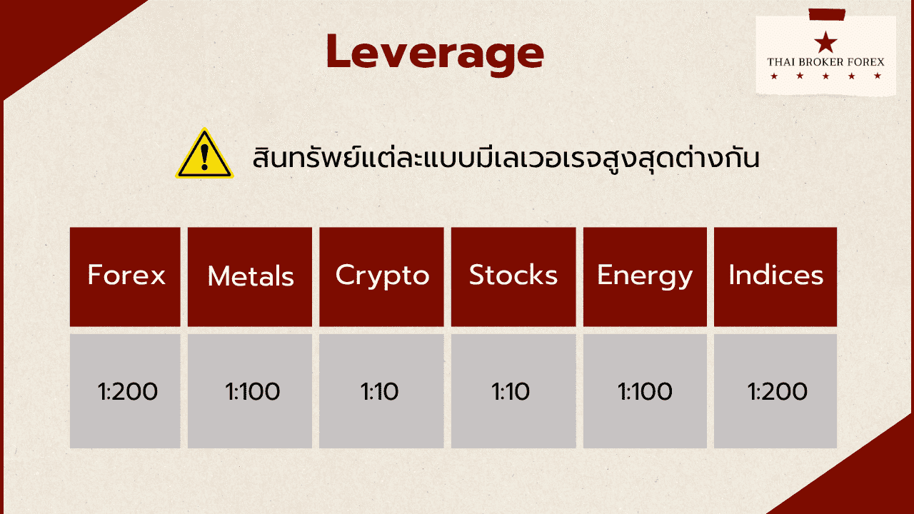 - เลเวอเรจสูงสุดแค่ 1:200 ถือว่าน้อยมากถ้าเทียบกับโบรกเกอร์อื่นที่ส่วนใหญ่ให้ 1:2000 (โบรกเกอร์ชั้นนำบางเจ้าให้ 1:ไม่จำกัด)