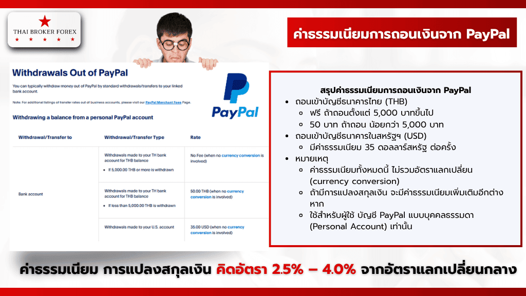 รายละเอียดตัวอย่างค่าธรรมเนียมในการถอนเงินจาก Paypal ที่ฟรี ถ้าถอนตั้งแต่ 5,000 บาทขึ้นไป ส่วนตัวค่าธรรมเนียมการแปลงสกุลเงินจะอยู่ที่สูงสุด 4.0%