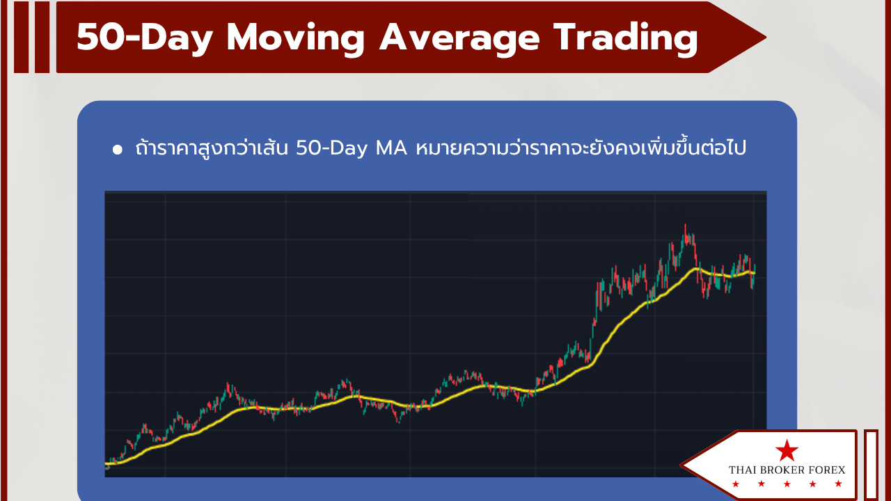 - 50-Day Moving Average ช่วยให้เห็นแนวโน้มราคาชัดเจน เพราะเป็นราคาปัจจุบันที่เทียบกับค่าเฉลี่ย 50 วันที่ผ่านมา