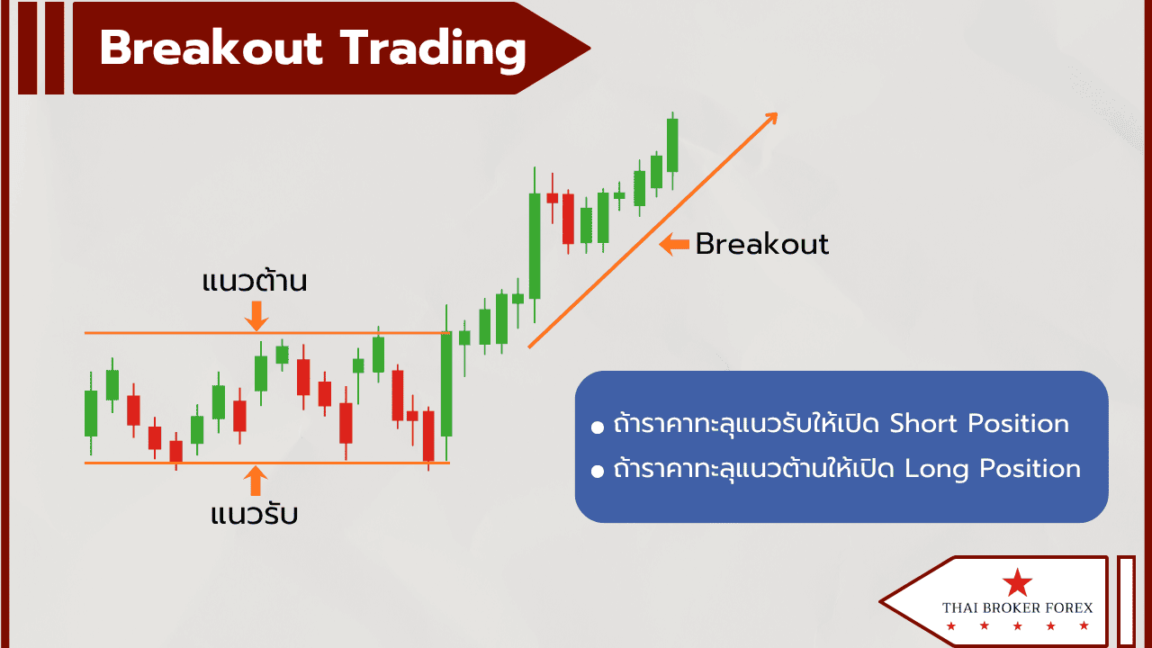 Breakout Trading เป็นการรอให้ราคาสินทรัพย์ทะลุแนวรับหรือแนวต้าน (Breakout) แล้วเริ่มเข้าซื้อขาย ยิ่งราคาทะลุแนวมากกว่า 1 ครั้งก็หมายความว่าสัญญาณนั้นยิ่งชัดเจน ยิ่งแข็งแกร่งมากขึ้น ส่วนใหญ่แล้วการทำ Position Trading ใน Forex จะใช้กลยุทธ์นี้
