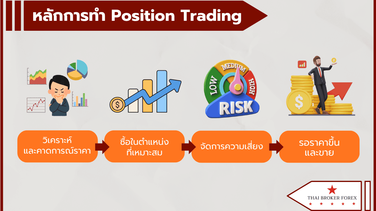 Position Trading จะมีหลักคือการถือสถานะลงทุนแบบระยะยาว ซึ่งจะต้องใช้ การวิเคราะห์ ทั้งปัจจัยพื้นฐานและเชิงเทคนิคเพื่อหาแนวโน้มที่แข็งแกร่ง จากนั้นก็เข้าซื้อเมื่อราคาผ่านแนวรับหรือแนวต้านที่เหมาะสม ถ้าถือสถานะซื้อขายนั้นได้นานพอก็จะได้กำไรกลับมาอย่างคุ้มค่า