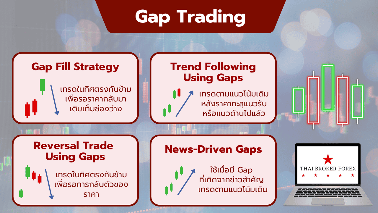 • Gap Fill Strategy ใช้เมื่อเปิดตลาดแล้วเจอ Gap ทันที ให้เข้าเทรดในทิศทางตรงกันข้ามกับแนวโน้มปัจจุบัน
